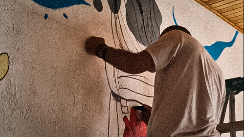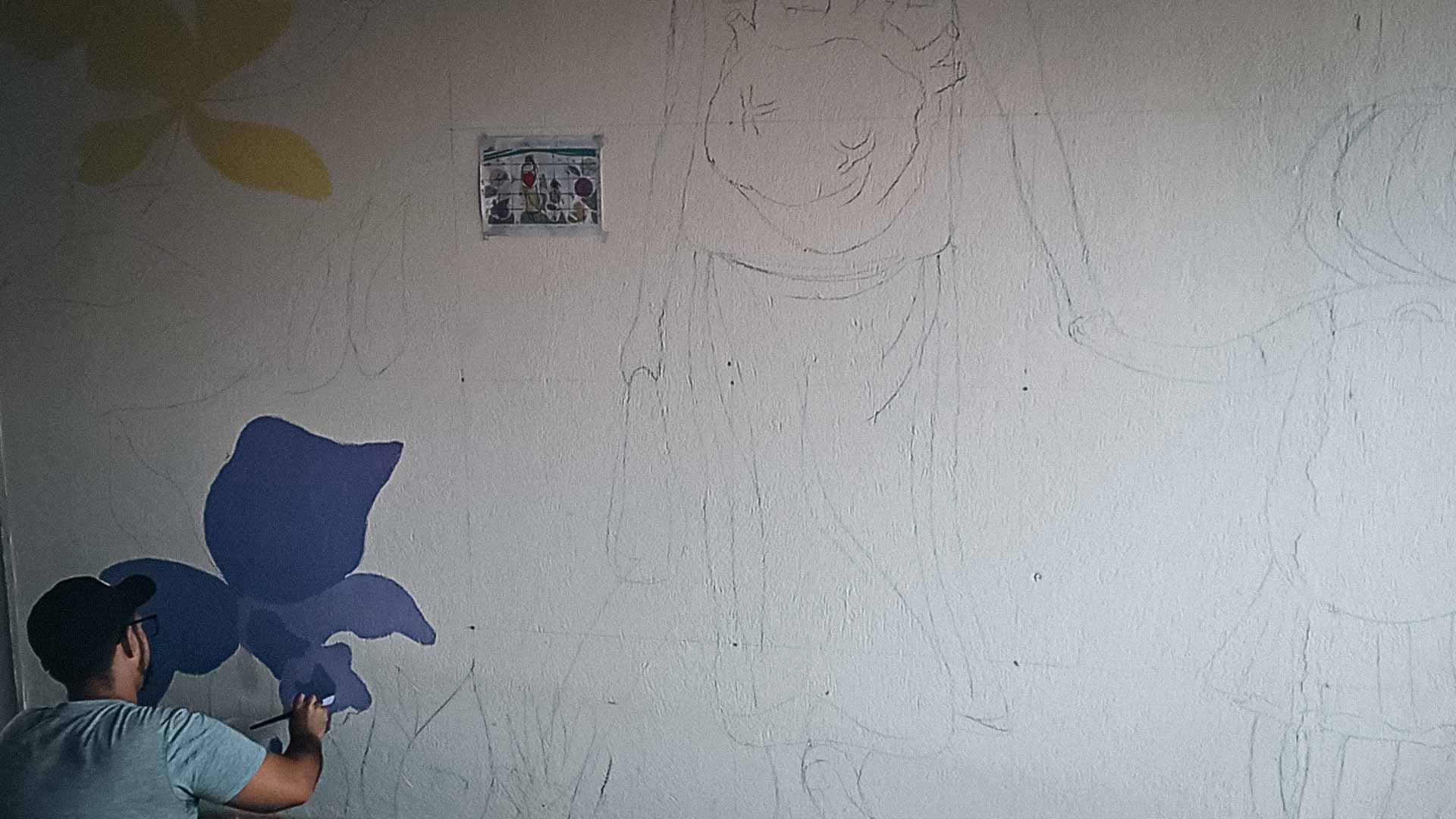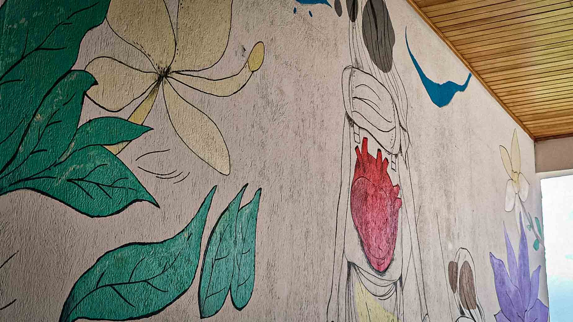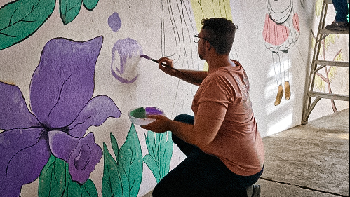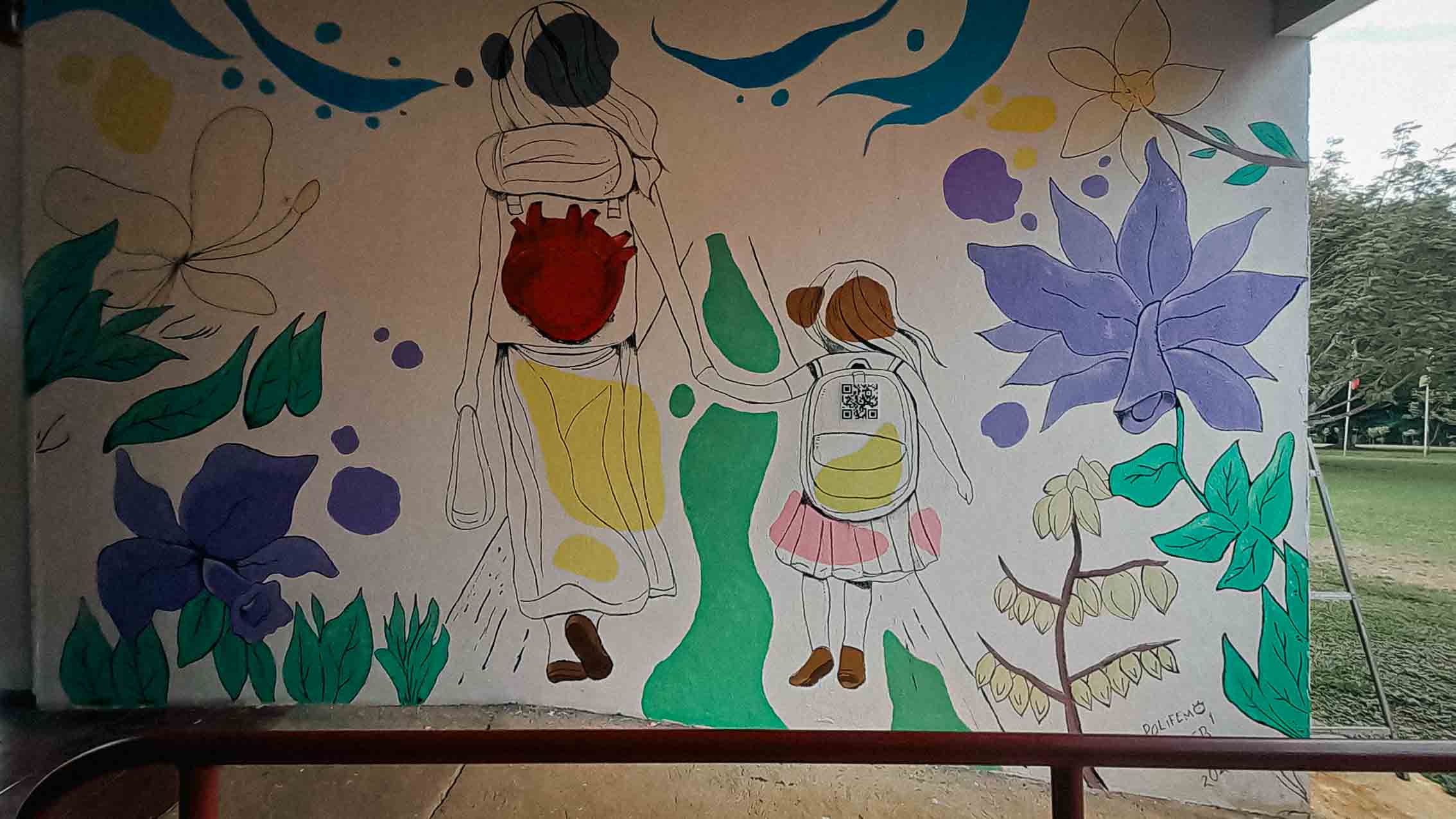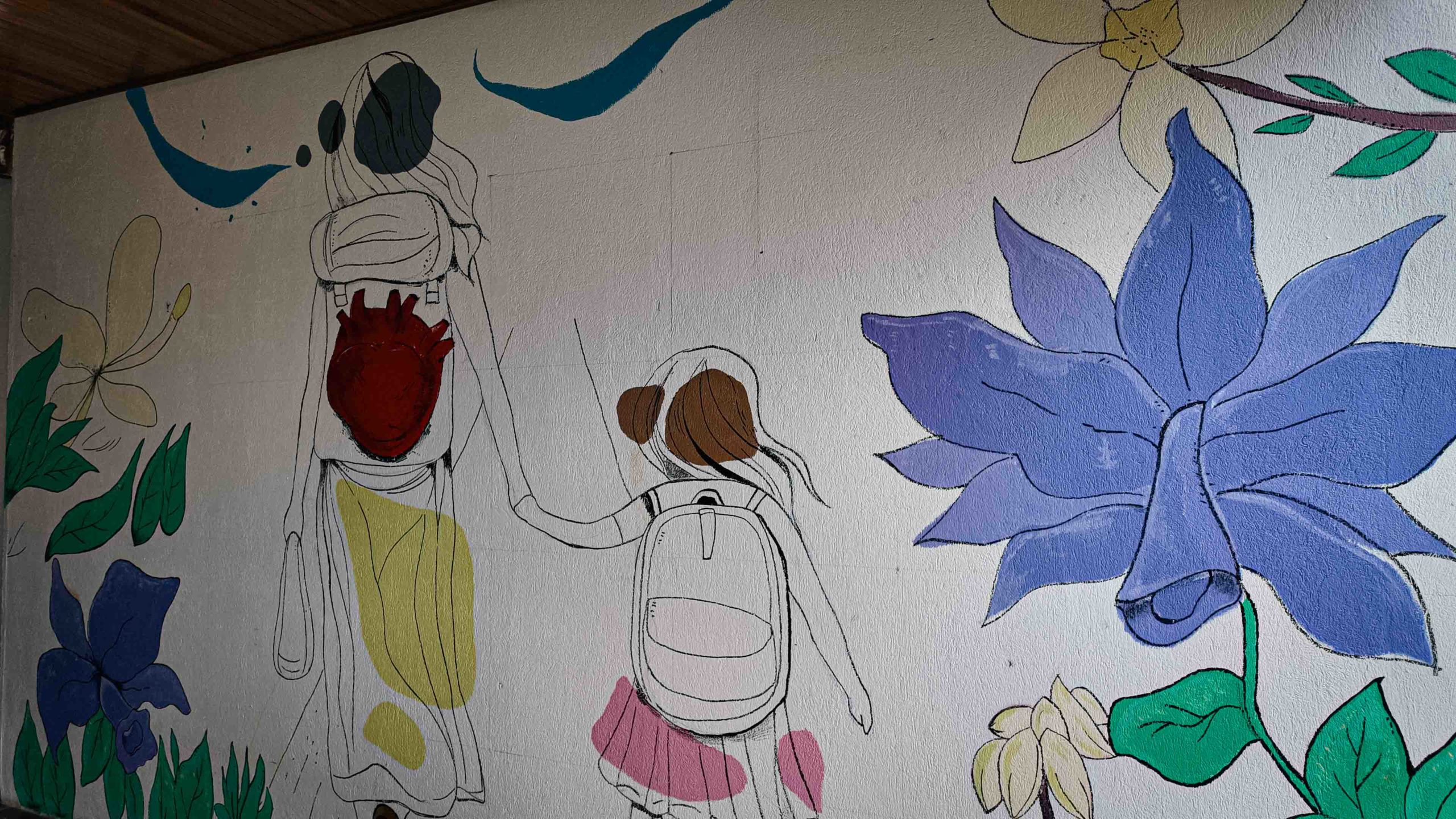 En nuestro mural, se muestra a una mujer y una niña representando a las personas migrantes. Ambas caminan hacia adelante, dejando atrás flores y colores. Las flores representan varios países de Latinoamérica (Cuba, Venezuela, Nicaragua, El Salvador, Costa Rica), y los colores desperdigados simbolizan que lo que se queda atrás va perdiendo nitidez ante todo lo que le espera a la persona migrante.